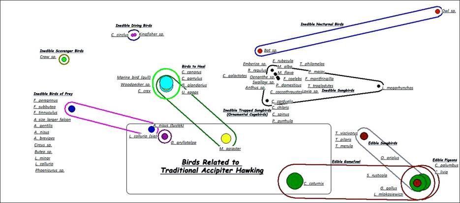 Analysis of pile sorts that were clustered according to participants’ answers were grouped as falconry, raptor, game, edible, inedible, to heal/medicinal, song, nocturnal, trap, scavenger, and diver (Table 1, Figure 3). The local classification is always according to use. For example, the results of the pile sorts confirm that all clusters of shrikes, raptors (gacho and shachuli), and Eurasian golden oriole (Oriolus oriolus), were never classified as songbirds, but instead were classified as game.