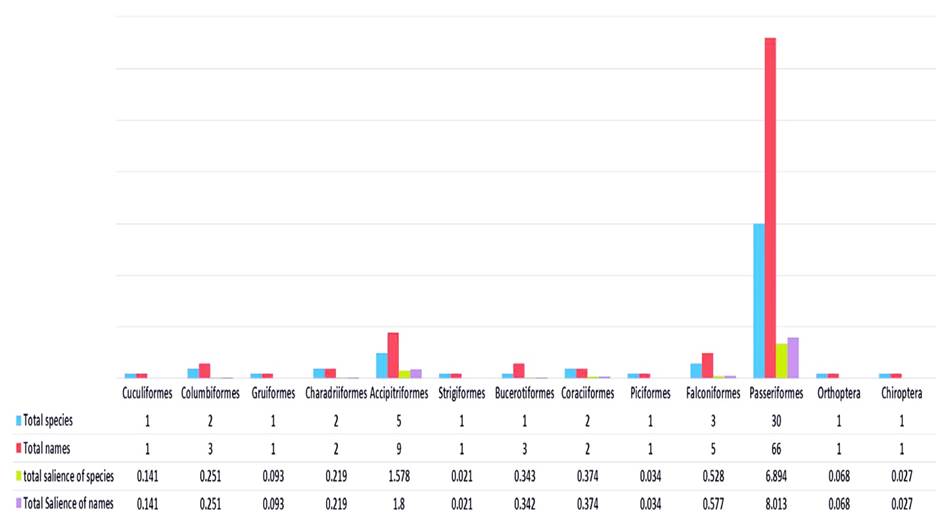 Figure 5 Number and salience of bird names as they relate to 14 orders and 58 species of birds in the study area.